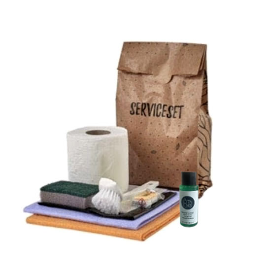 | Anmerkung: | Ein Take-me-Home-Reinigungsset. Gäste nehmen gerne die Spülbürste oder die nicht benutzten Dinge mit nach Hause. Eine schöne Erinnerung an einen schönen Urlaub. Die Papiertüte wird von den Gästen gerne für den BIO-Abfall verwendet. |