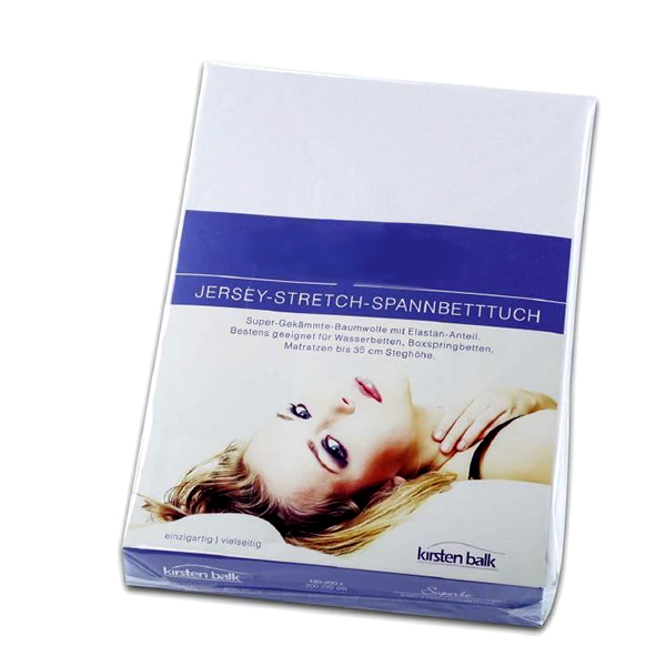 Jersey Spannbetttuch für Boxspringbetten hergestellt aus 97% gekämmter Baumwolle mit 3% Elasten. Feinste super gekämmte Baumwollgarne mit Elastan kombiniert garantieren beste Stretch-Eigenschaften. Das Spannbetttuch für Boxspring Obermatratzen hat eine perfekte Passform. Das sehr feine Strickbild, der weiche und edle Griff, sowie der faltenfreie Sitz, welcher durch die hohe Stretch-Eigenschaften des Tuches gewährleistet wird und die lange Lebensdauer, machen dieses Spannbetttuch zum Langzeit-Erfolgs-Produkt.